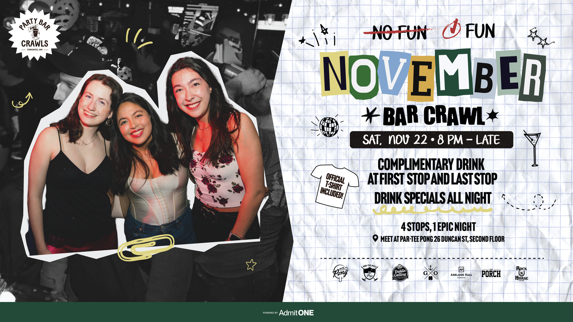 It’s finally No Fun November Bar Crawl—and the name says it all. November doesn’t have to be dull when you’ve got cocktails, dance floors, and good vibes waiting at every stop. 🍂🍸